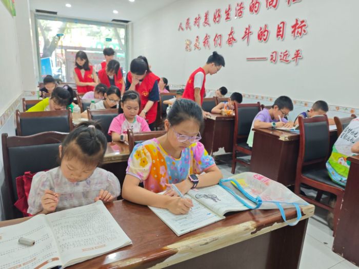 圖為百川匯安社會實踐隊隊員為學生開展課業輔導。賀瑜攝。