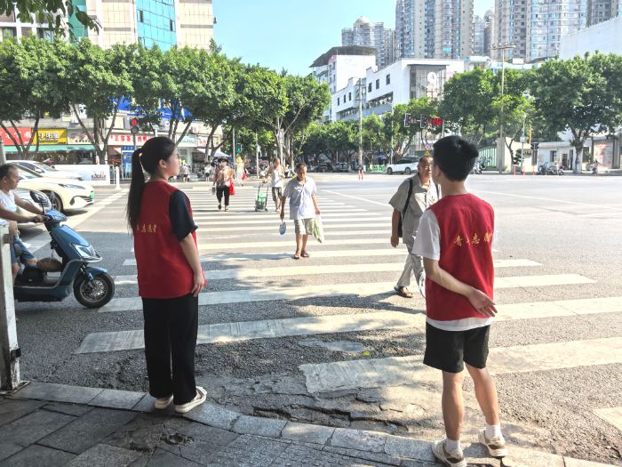 圖為百川匯安社會實踐隊隊員在交通路口擔任“文明守護者”。賀瑜攝。
