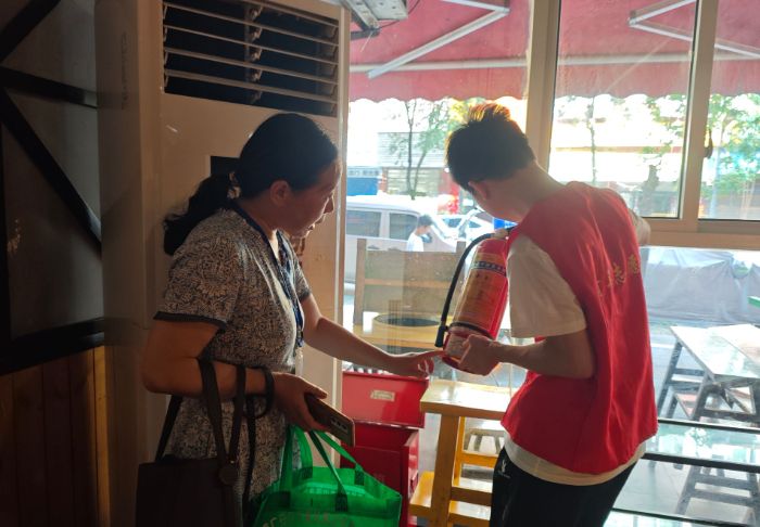 針對夏季安全事故高發特點,實踐隊聯合社區網格員開展專項檢查,同時,隊員們在社區工作者的帶領下進行社區巡邏,排查潛在的安全隱患。在巷道內,隊員記錄電動車飛線充電點位12處,然后有針對性地對居民宣傳了“電動車違規充電起火”的案例,警示社區居民提高電路防火安全意識。事后,隊員一同建議居委會加裝智能充電樁,進一步規范社區電路,也給居民提供便利;排查食品、餐飲店時,隊員賀濤、賀瑜發現兩例典型案例,一是餐飲店滅火器過期,存在滅火功能失效的風險,當即指導整改;二是部分食品店未及時清理過期產品,對消費者的安全未負到應有的責任。社區書記表示:“安全問題存在于居民生活的方方面面,需仔細檢查,馬虎不得。”