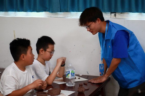 圖為實踐隊成員與榮州書畫培訓(xùn)學(xué)校新城分校的小朋友們共同完成土陶作品。楊欣霖供圖