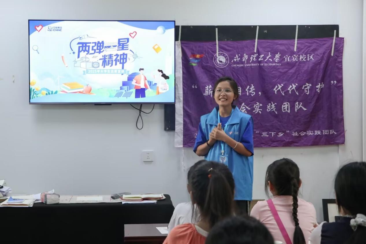 圖為實踐隊成員為小朋友們講解“兩彈一星”精神。楊欣霖 供圖