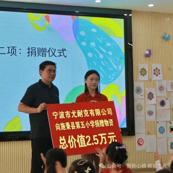 在隨后舉行的捐贈儀式上,寧波市尤耐克有限公司和寧波大狼窗飾有限公司分別向學校捐贈了價值2.5萬元和2萬元的教學物資,這些物資將用于改善學校的辦學條件。校方代表與實踐隊共同完成了捐贈物資的交接工作。