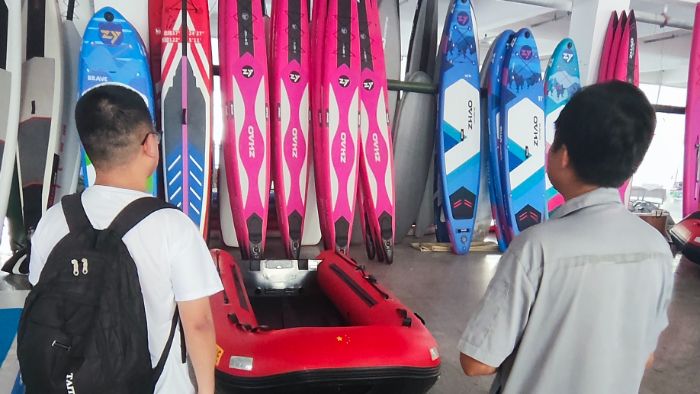 活動伊始,企業技工師傅向隊員們系統介紹了充氣式槳板行業的先進制造技術。隊員們重點學習了RSS橫梁結構、四弦系統及張力線系統的工藝原理,通過技術圖紙與實物對比,直觀理解了不同結構設計對槳板穩定性的增強作用。在氣墊船制造車間,師傅帶領隊員們參觀了充氣結構的全流程工藝。從高強度織物裁剪、熱熔拼接至氣密性檢測,隊員們發現氣墊船與槳板在材料處理、粘合工藝等環節存在高度相似性。實踐隊隊員常新杰表示,“通過對比兩種產品的制造流程,我們更清晰地掌握了充氣結構‘輕量化與高強度平衡’的核心設計邏輯。”